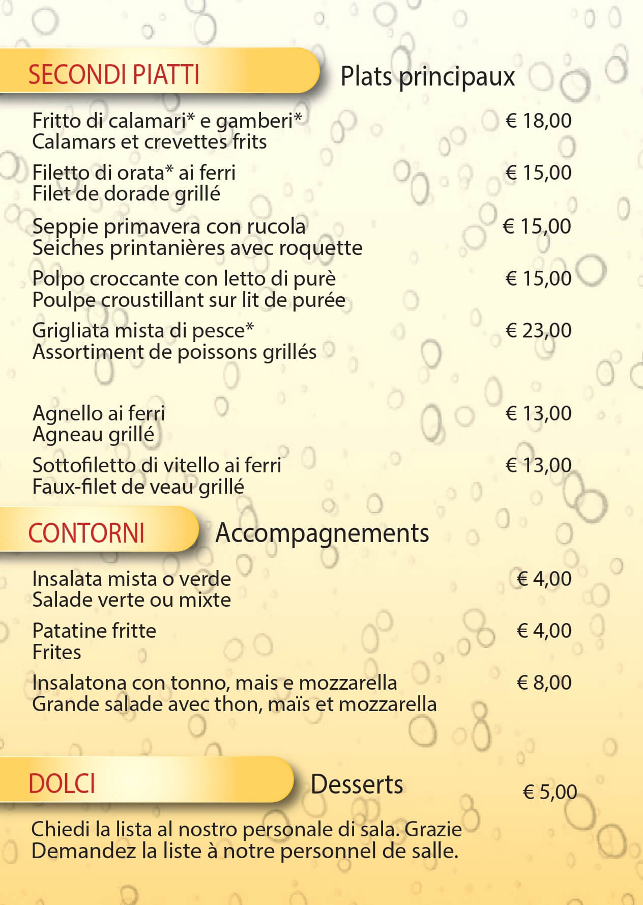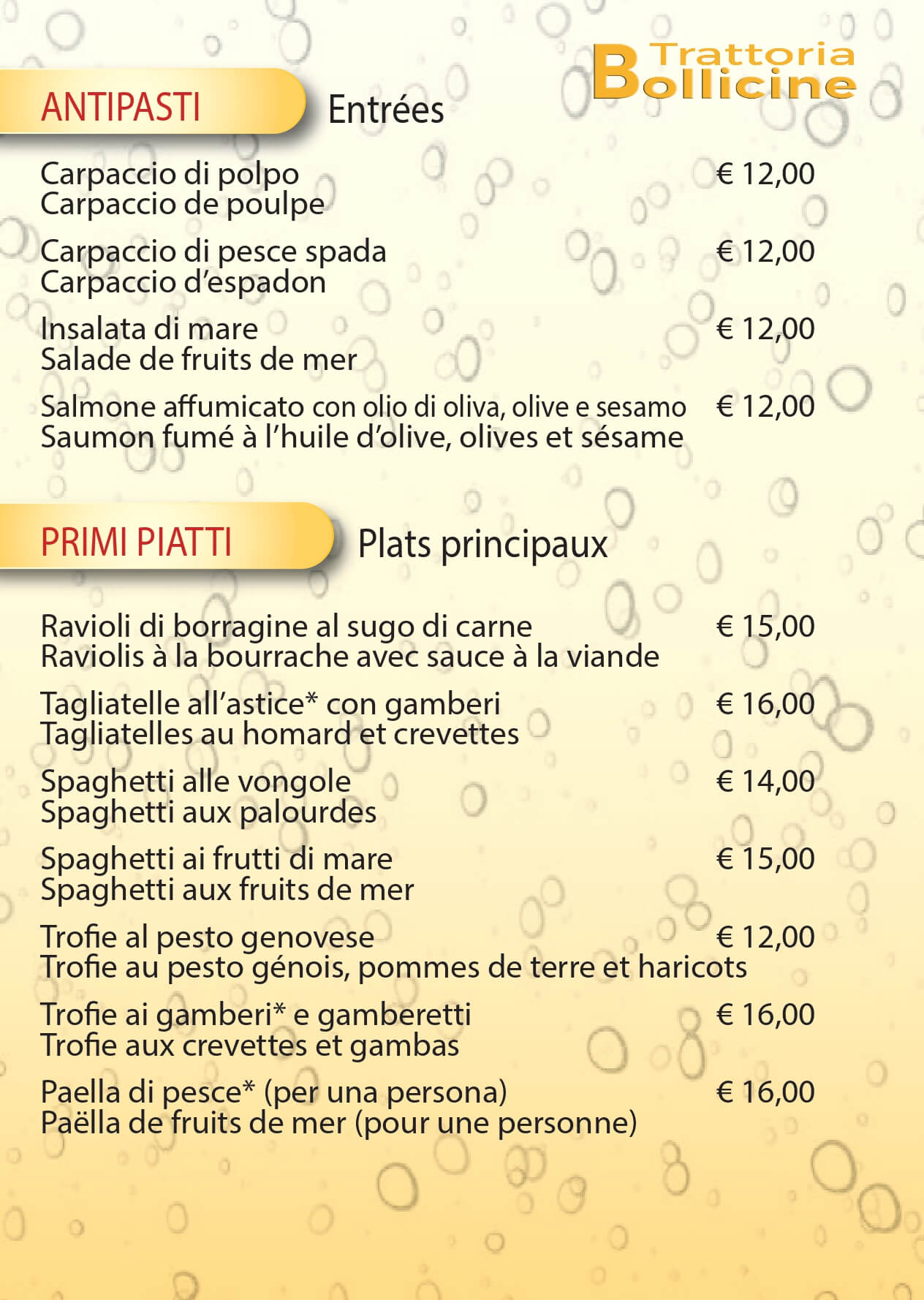 "Bienvenue à la Trattoria Bollicine ! Nous vous souhaitons un bon appétit et un merveilleux moment dans notre restaurant."